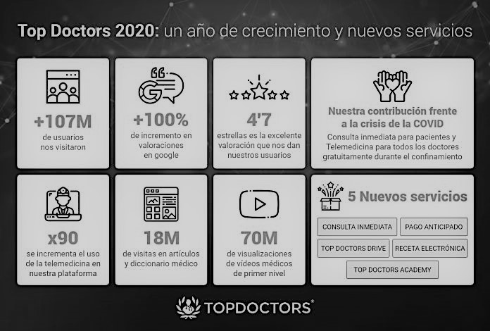 Gracias a ello, Top Doctors ha visto cómo a lo largo del 2020 la búsqueda de información de salud en su plataforma alcanzando los 100.000 millones de visitas, se cerraban 2 mil millones de citas médicas y el uso de la telemedicina se multiplicaba por 90.