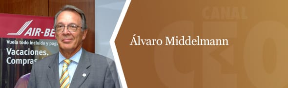 Álvaro Middelmann, director general de Air Berlín para España y Portugal, no es sólo eso. Miembro de la Junta directiva de Exceltur, es un hombre de los que están en todas partes. El también presidente de la Comisión de Transporte de la Cámara de Comercio de Mallorca, y miembro de la Junta directiva de APD Baleares, hace honor a su cargo viajando allá donde haya algo de su interés. En la actualidad, es CEO de la consultora Middelmann IMS&Consulting, y fué presidente fundador de la Asociación Española de Compañías aéreas (AECA).