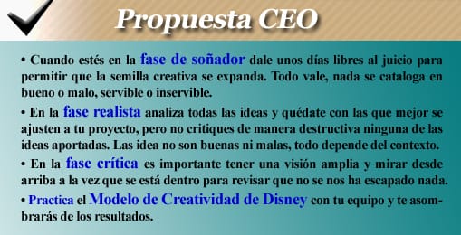 El Modelo de Creatividad de Disney es un proceso circular y se retroalimenta constantemente. Ahí está su gracia, ya que no consiste en pasar de una etapa a otra sin más. En muchos casos, hay que volver a la etapa de soñador para rescatar algunas ideas que el realista tiró a la basura. Del mismo modo, el crítico puede descubrir puntos de mejora que quizá deban ser revisados por el creador ya sea en su fase inicial de soñador o en la etapa realista. Es importante señalar que el paso de un estado a otro debe realizarse de manera completa; es decir, si estamos en modo soñador no podemos descartar ideas porque ese es el papel del realista, ni hacer comentarios negativos que son más propios del crítico. Si no queremos limitar o, peor aún, matar la capacidad creativa, soñemos en la fase soñadora, evaluemos en la realista y pongámonos el sombrero de la mejora en la fase crítica, pero no llevemos el traje equivocado a la fiesta a la que nos han invitado.