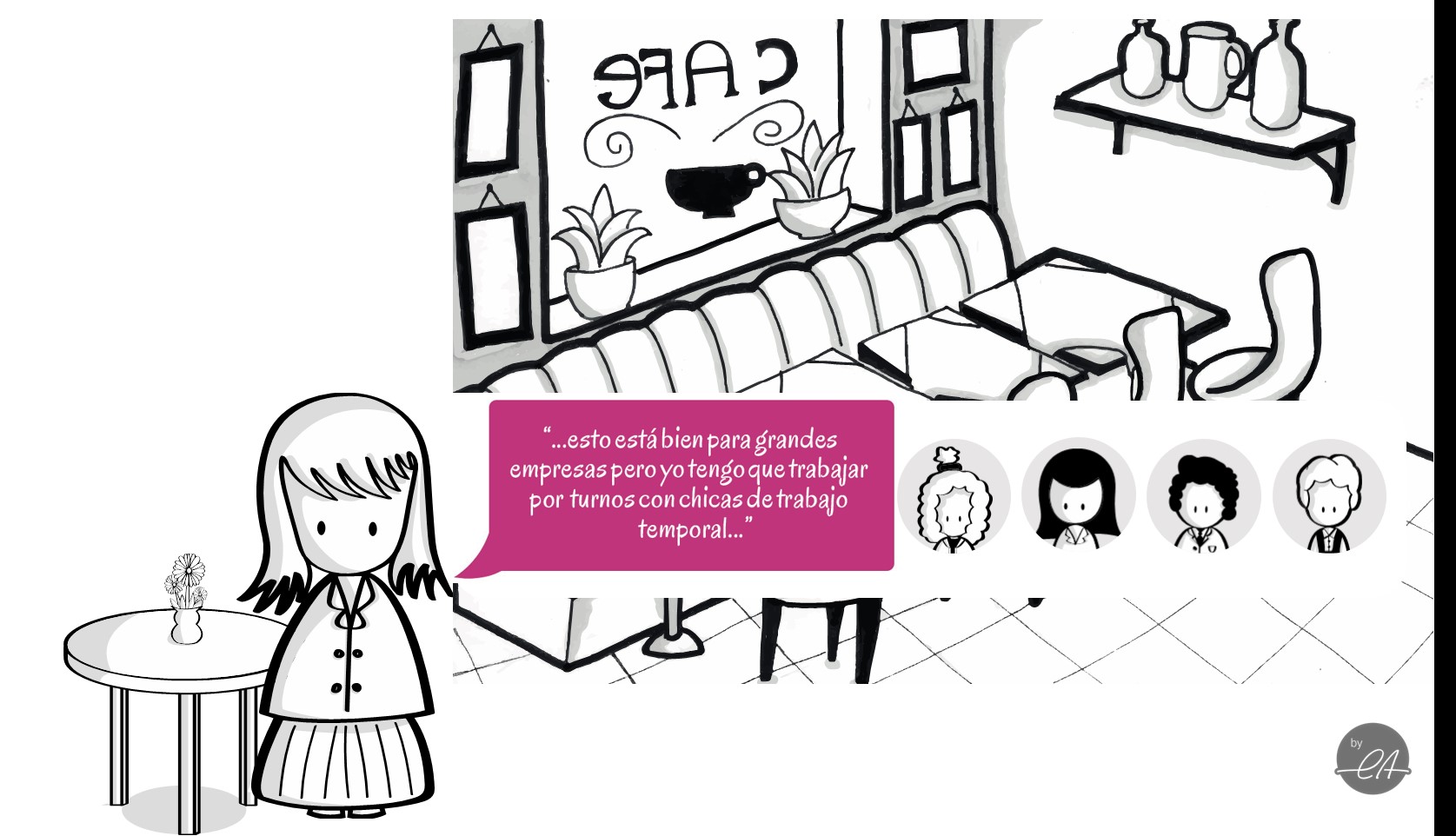 ¿Y cómo se han creado estos personajes? Proceden de experiencias reales con negocios que ilustran al alumn@ preguntas que se pueden estar haciendo en cada momento de forma interna. A cada cuestión se le da respuesta adaptándola a los frenos y oportunidades que pueden darse en cada negocio en cuestión.