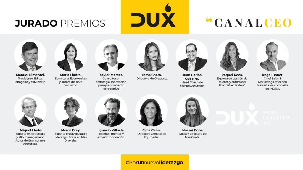 Poco a poco vamos desvelando más detalles sobre los Premios DUX Canal CEO, unos galardones que buscan dar visibilidad a todos aquellos líderes visionarios que rompen con lo establecido e impulsan nuevas formas de liderazgo en las empresas. Porque en un mundo cómo el actual necesitamos de líderes auténticos, que estén convencidos de que las empresas son parte de la transformación que estamos viviendo, hemos reunido en el jurado a diez expertos en management, comunicación, el coaching, la economía, el talento, el bienestar y la empresa liderados por Manuel Pimentel y María Lladró.